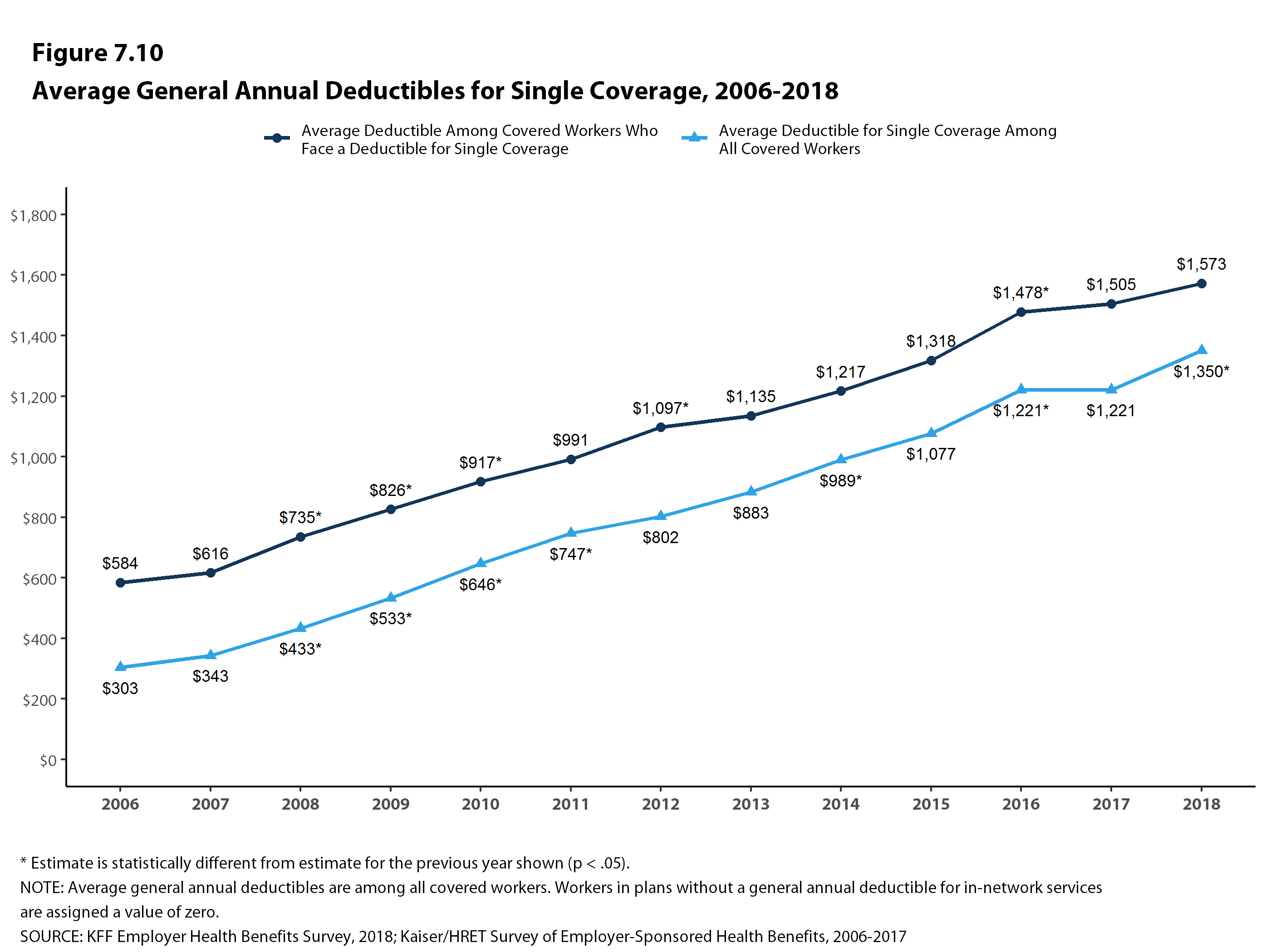 About half of Americans get their health insurance through their employer. Over the period 2006–2016, the number of people responsible for a deductible through their healthcare plan increased from 59% in 2006 to 85% in 2016. Between 2006–2018, the average deductible for single coverage insurance increased from $584 annually to $1,573, an increase of almost 63%.